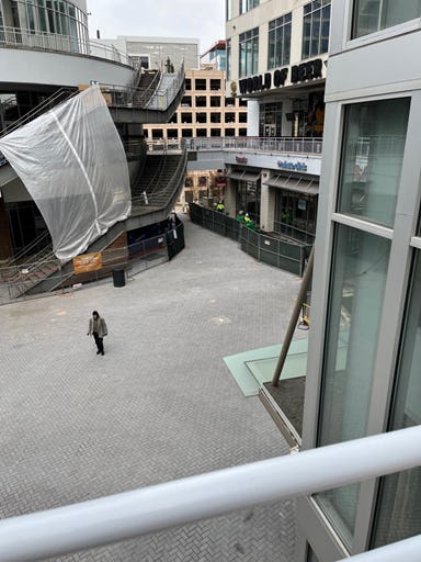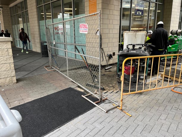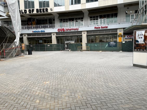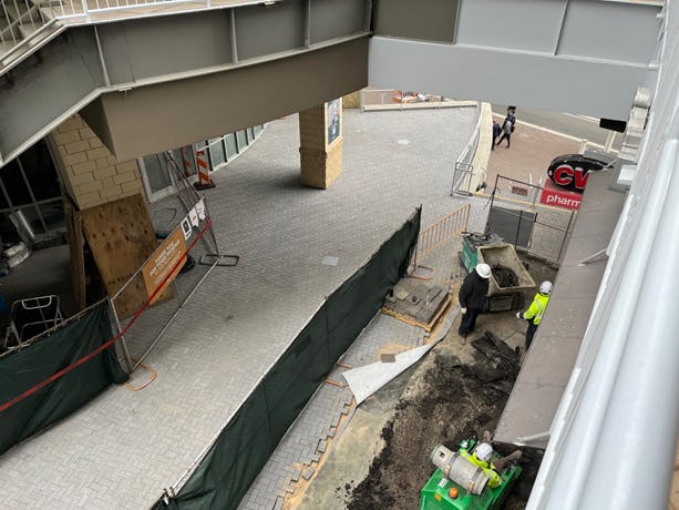 Demo underway to the right of the CVS door. Work at CVS door will be done off hours.