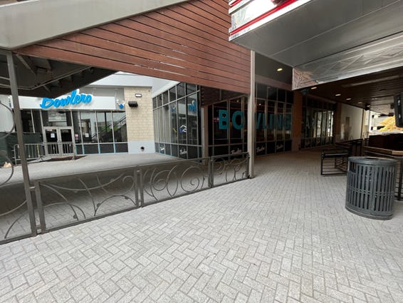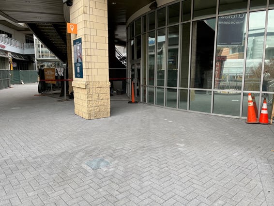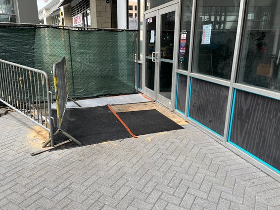 View of Bowlero door and measure taken to maintain access during paver install.