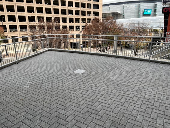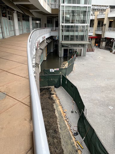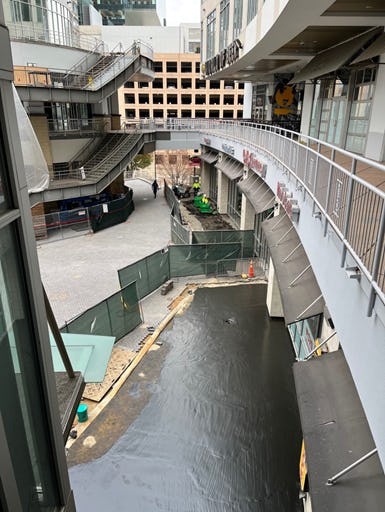 2nd floor view of Phase 3 – area between Bowlero and CVS waterproofing curing.